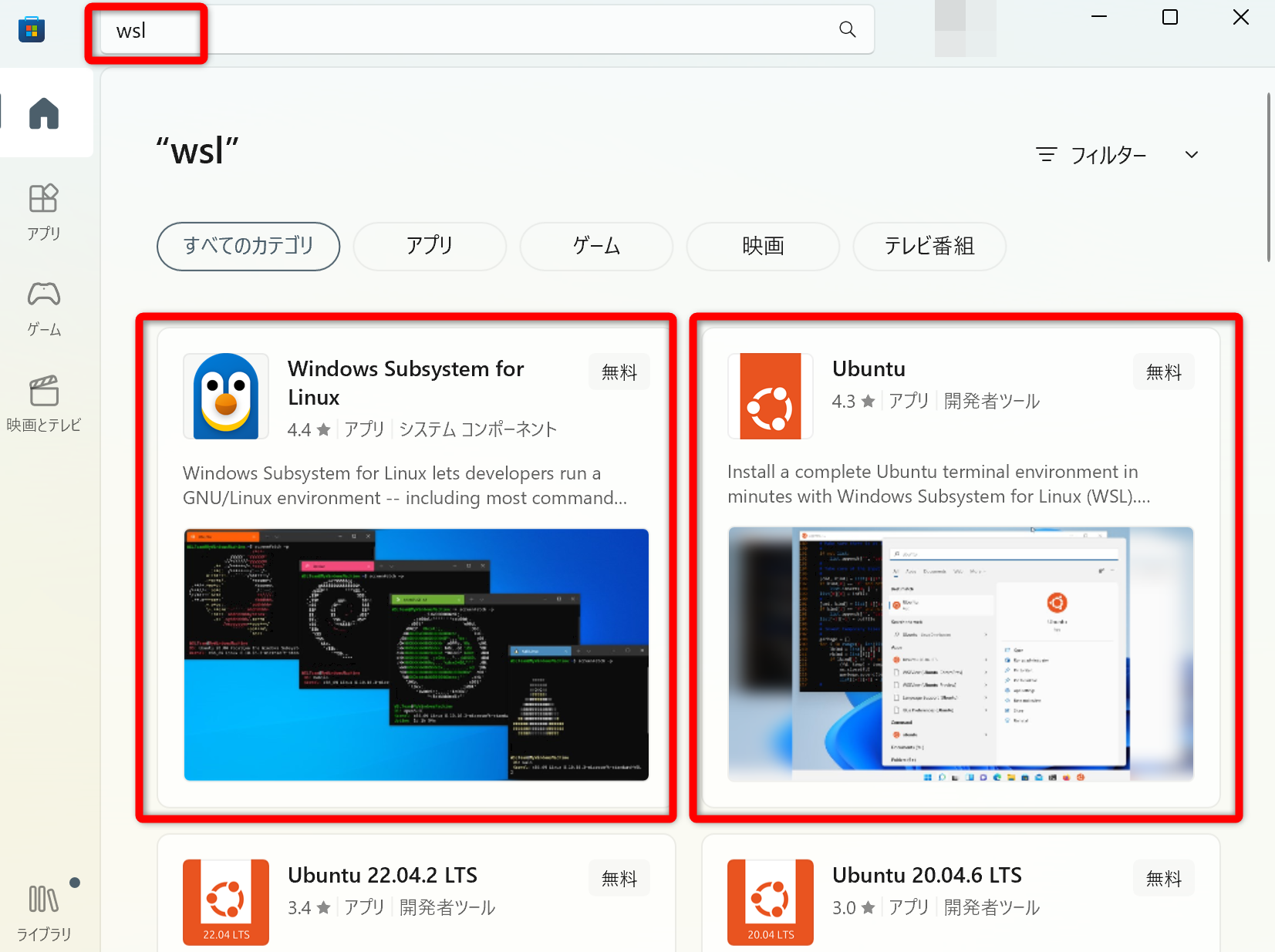 Microsoft Store で「wsl」と検索し、「Windows Subsystem for Linux」と「Ubuntu」をインストール。